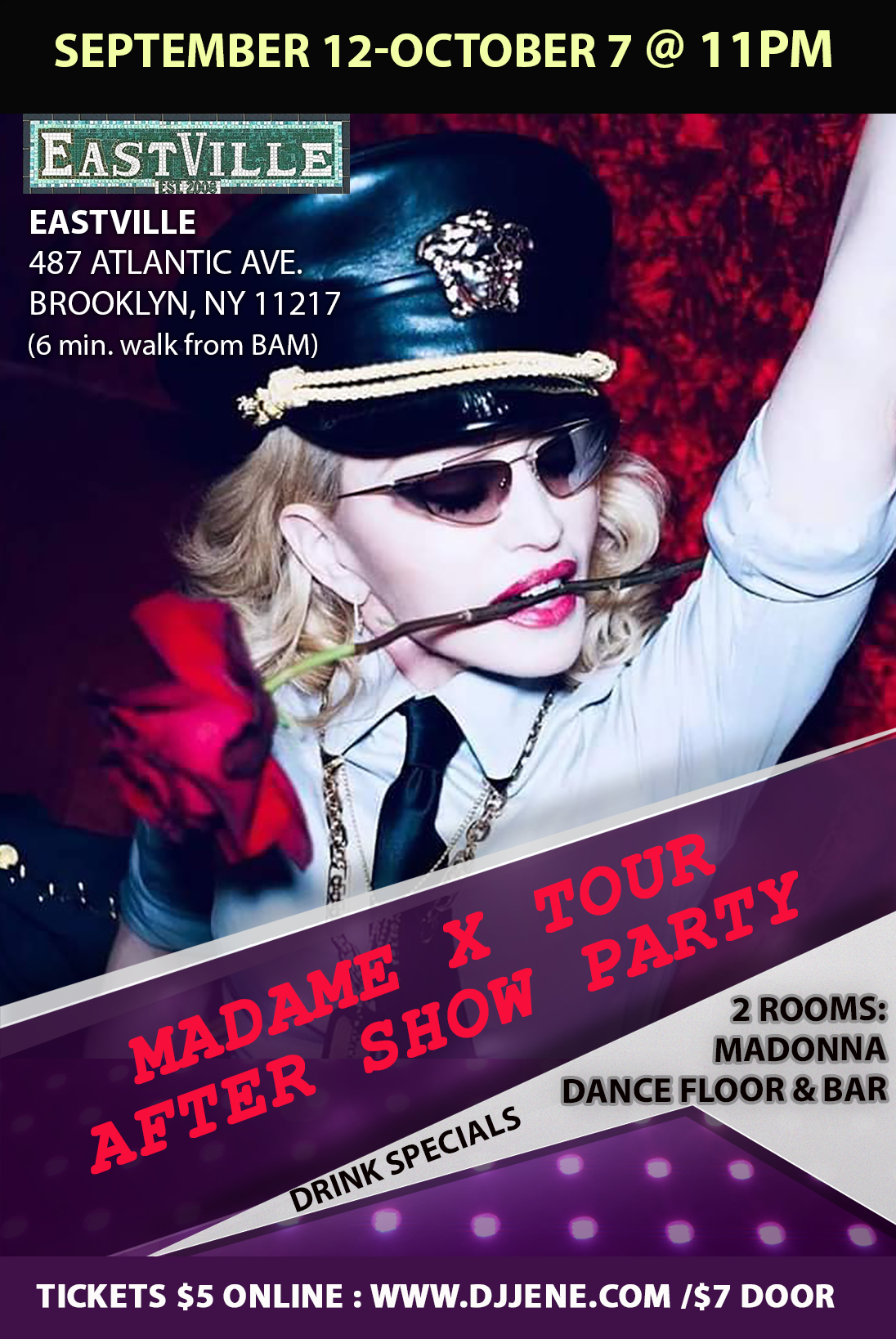 It seems, like Jeannie, me and my doggie Maya are moving to Brooklyn ha..ha.. ha. And we will have 18 Madonna Parties at EastVille!!! EastVille is a very famous comedy club in Brooklyn, where stand up shows happen with the most famous comedians like Amy Shummer, Tracey Morgan, Sarah Silverman, and many others. They have comedy shows till 10 pm and afterwards we will turn this comedy space into a Madonna night. We will have 2 rooms -a bar, where Madonna fans can chill after the show, including special Madonna inspired drink menu and share their thoughts about the show! In another room – is the dance floor with a stage (and we already have amazing ideas about how to use that stage), where DJ Jeannie will play the best music of our Queen. Each after party begins at 11 pm and even fans who can’t attend the Madame X show are welcome to come the party. Entry fee is $5, if you pre-order your ticket online and $7 at the door.