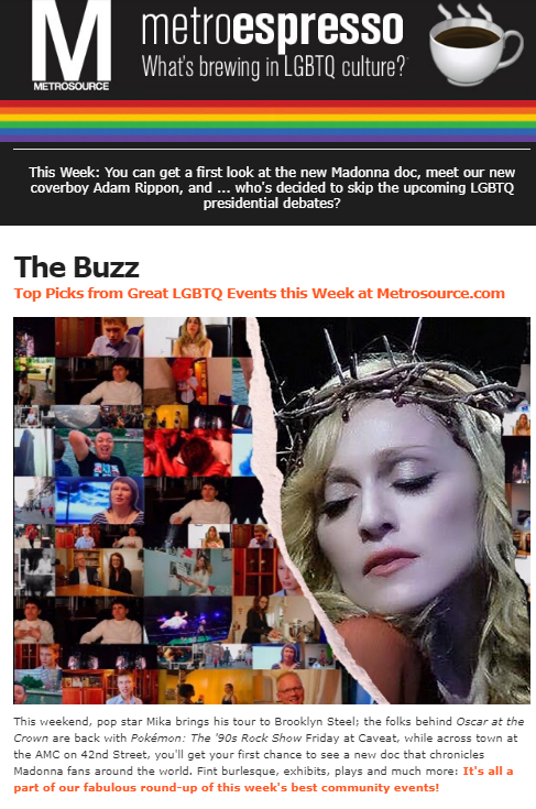 Media Support Metro Source: LGBTQ Event of the week “Like a Prayer” September 9, 2019 This Week’s Best LGBTQ Events in New York City ⭐ Rating: 1 out of 5. Share this:TweetLike Loading...